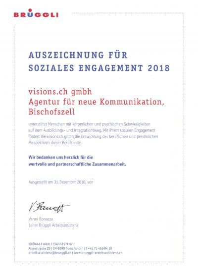 visions.ch gmbh - Thurgauer Webagentur. Agentur-News: Wir schätzen uns glücklich über die Auszeichnung der BRÜGGLI ARBEITSASSISTENZ für das soziale Engagement im Jahr 2018. Wir nehmen die Auszeichnung mit Freude entgegen. Herzlichen Dank für die erfolgreiche Zusammenarbeit.