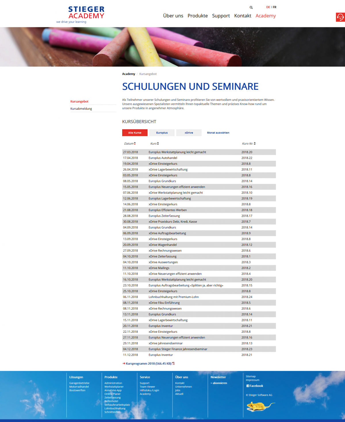 Die Stieger Software AG aus Staad ist die Nummer 1 auf dem Schweizer Software Markt für Garagensoftware, für Software für den Motorradhandel und für Bootwerften. Stieger bietet Gesamtlösungen exakt auf die Branche abgestimmt. In Zusammenarbeit mit der Kommunikationsagentur des Kunden realisiert visions.ch die neue Website die viel Information und Kundennutzen bietet. Neben Produktinformationen realiserte visions.ch eine interaktive mehrsprachige Kursverwaltung mit E-Mail Funktionen und Kursmanagemet z.B. Zuodernung des Kursleiters im Backend. Buchbar sind Einzel- und Kombikurse. Die Page ist mehrsprachig und bietet differenzierte deutschsprachige Inhalte für CH und AT. Weitere Features sind Newsbereich mit Archivfunktion, Newsletter, visualisierte Standorte und geschützte Bereiche.