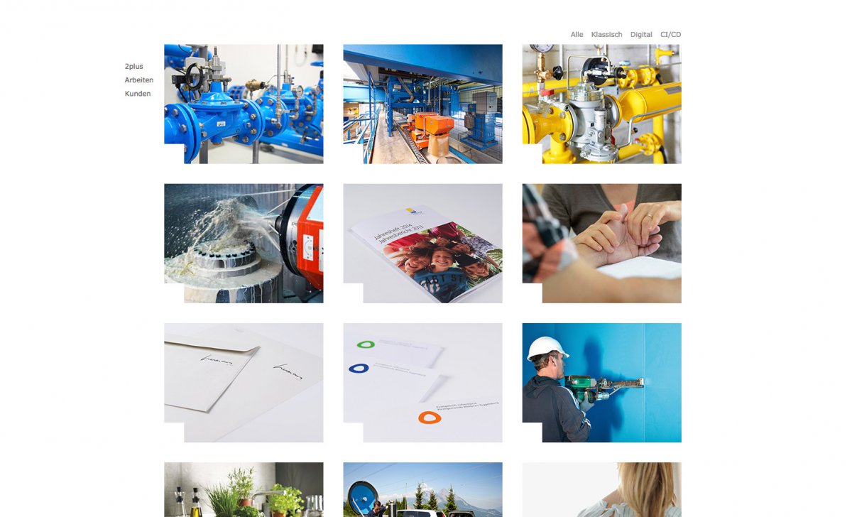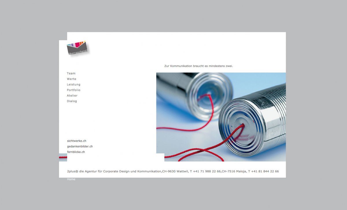 Die Werbeagentur 2plus verwendet für die Eigenwerbung die Idee der Gedankenbilder - bekannte Sprichwörter mit eigenen Fotos illustriert. Visions realisierte die Online-Version, ein Marketingtool, das vom Kunden einfach administriert werden kann. Wöchentlich wird ein neues Gedankenbild präsentiert und die früheren Bilder werden automatisch archiviert, die Gedankenbilder können auch per Mail versandt werden.