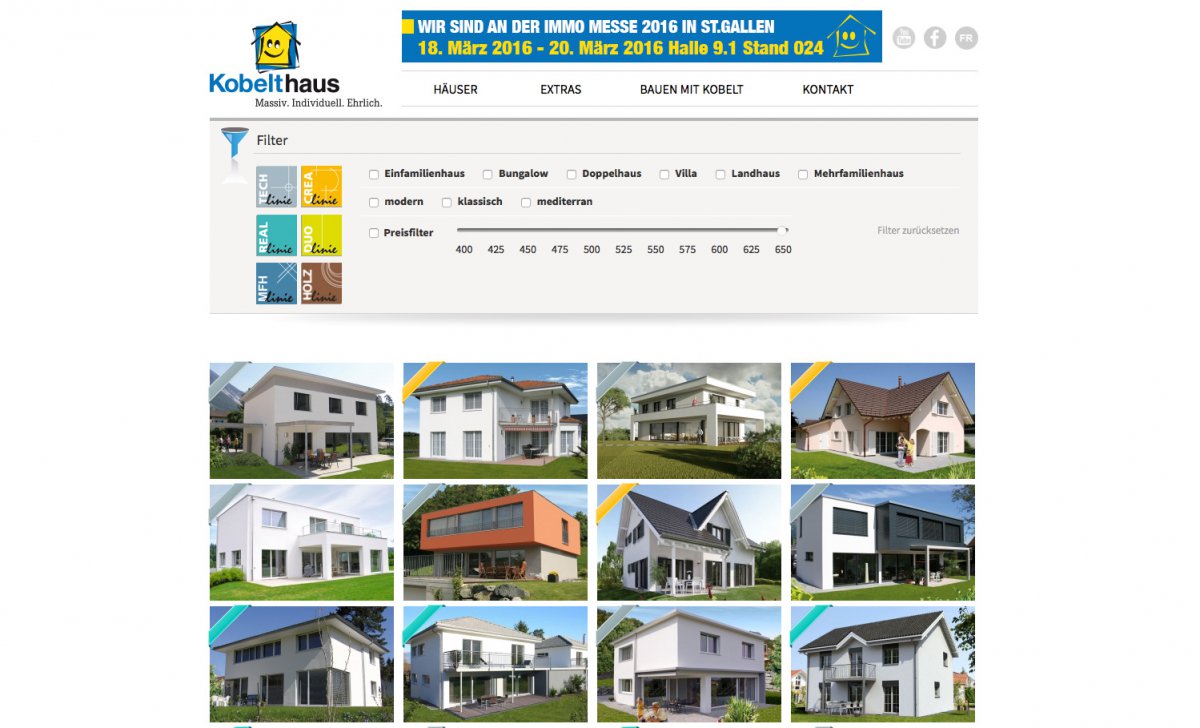 visions.ch hat die Kundenwebseite www.kobelthaus.ch technisch realisiert mit interaktivem Konfigurator / Hausfilter und Call-to-Action-Komponenten zur Gewinnung von Adressen und Versand von Print-Infopaketen. Die Webseite wurde mit einem modernen Look & Feel umgesetzt - mit Fullscreen-Bildgalerien und Videointegration. Die übersichtliche Filterfunktion ermöglicht den Besuchern, das breite Angebot an Kobelt-Häusern nach individuellen Präferenzen zu sortieren und so auf schnellstem Weg das passende Angebot zu finden. Die Referenzgalerie sowie die Bildgalerien auf den Detailseiten laden zum Entdecken ein.