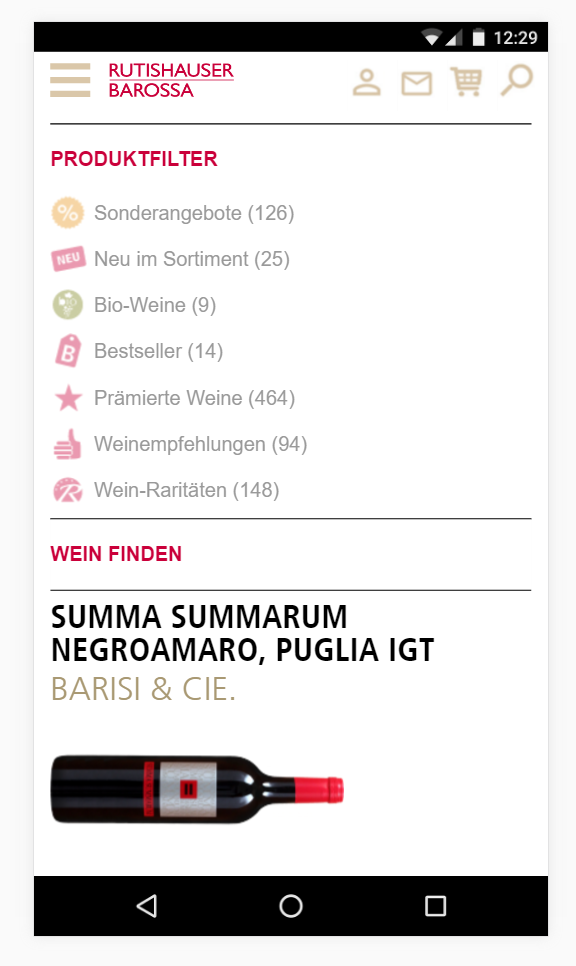 visions.ch gestaltet und realisiert die Mobile Version für den Webshop der Rutishauser Weinkellerei AG. Technologisch wurde die Page mit dem kompletten Shop nachträglich als OnPager full responsive realisiert. Kunden haben eine Login Funktion oder für Neukunden eine Registrierfunktion. Es wurde ein praktischer Produktefilter und eine Suchfunktion mit Weinfinder nach bestimmtem Kriterien inklusive einer Merkliste eingebaut.