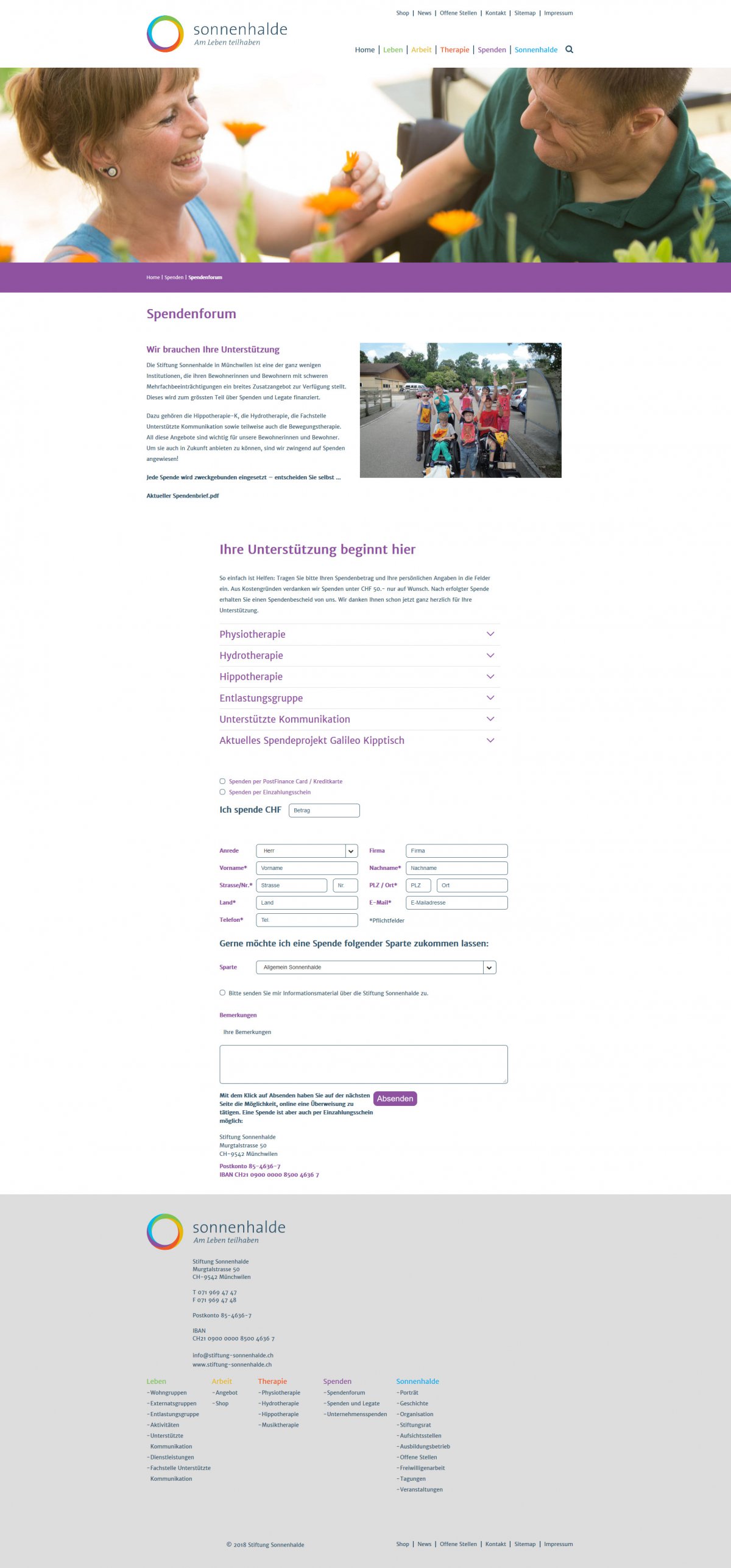 Die fröhlich und bunt gestaltete Webseite bietet Informationen rund um die Betreuungsangebote des Kompetenzzentrums in Weinfelden. Ebenso können im Onlineshop Produkte bezogen werden, welche von den Bewohnern gefertigt worden sind. Damit eine solche Institution längerfristig unterhalten werden kann, ist die Stiftung Sonnenhalde auf Spenden angewiesen. Auf der Webseite finden Sie diverse Möglichkeiten sich zu engagieren.