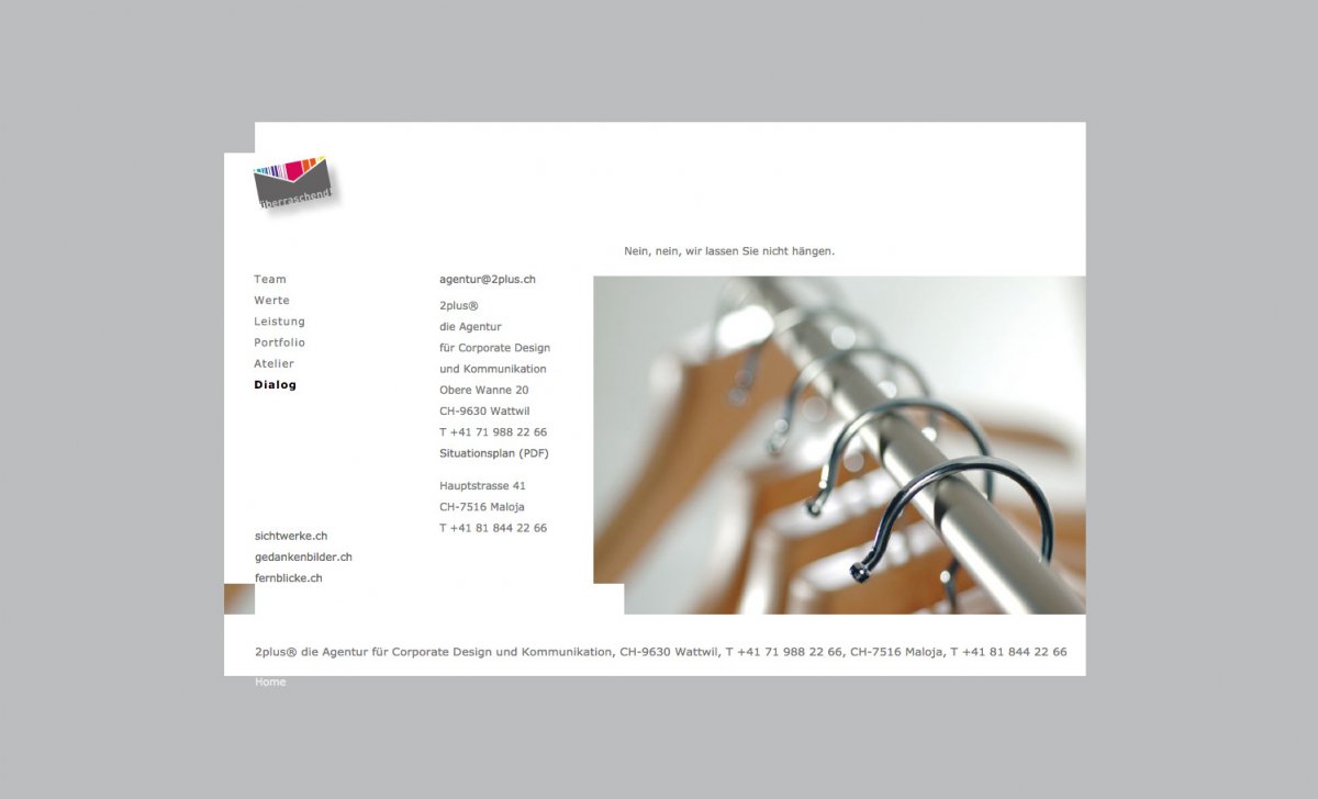 Die Werbeagentur 2plus verwendet für die Eigenwerbung die Idee der Gedankenbilder - bekannte Sprichwörter mit eigenen Fotos illustriert. Visions realisierte die Online-Version, ein Marketingtool, das vom Kunden einfach administriert werden kann. Wöchentlich wird ein neues Gedankenbild präsentiert und die früheren Bilder werden automatisch archiviert, die Gedankenbilder können auch per Mail versandt werden.