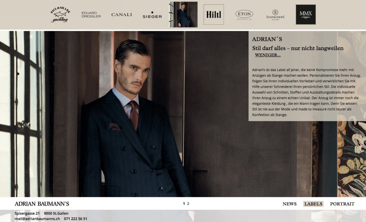 Für die Werbe- und Kreativagentur Alltag in St.Gallen durften wir die technische Realisierung der Webseite des bekannten St. Galler Modelabels Adrian Baumanns übernehmen. Focus der Webseite liegt auf der stimmigen Online Präsentation von bekannten Marken- und Männerbekleidung. Die Page ist responsive für Mobile und Tablet optimiert. Stimmige Page in der typischen Alltag Handschrift.