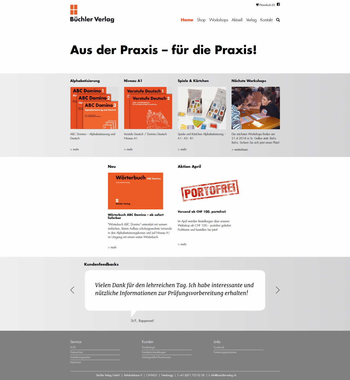 Der Büchler Verlag stellt seit mehr als 25 Jahren Lehrmittel für Deutschkurse zur Verfügung. Das Konzept des Verlages «Spielend Deutsch lernen» erfreut sich an grosser Beliebtheit. Die Lehrmittel sind darauf abgestimmt, dass die Teilnehmer möglichst schnell sich in der deutschen Sprache ausdrücken können und im Alltag selbständig zurechtkommen.