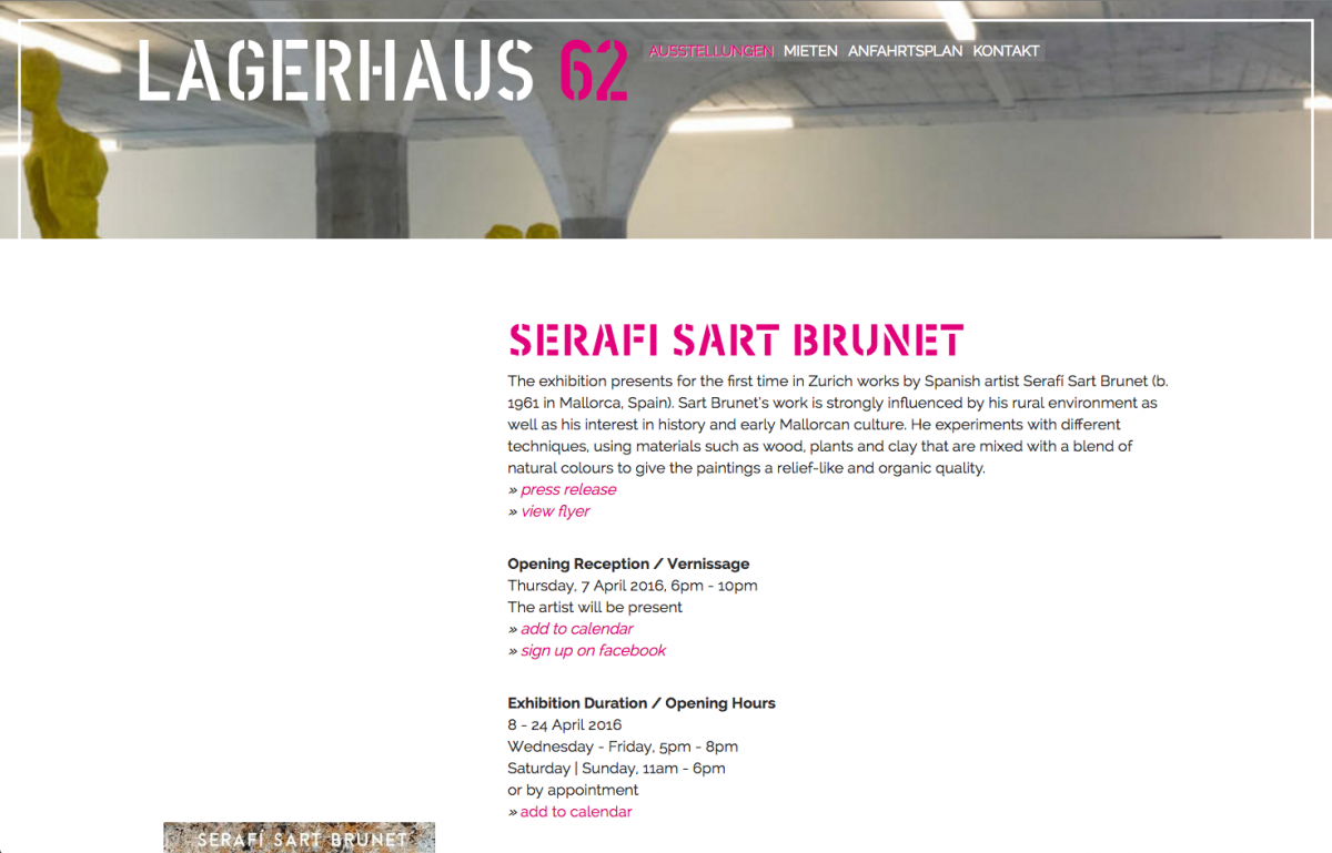 Stimmige Webseite für die Kunstgalerie lagerhaus62.com, Zürich Redesign und Relaunch der Website für das lagerhaus62.com, Responsive. Slider mit Veranstaltungen. Website voll vom Kunden administrierbar.