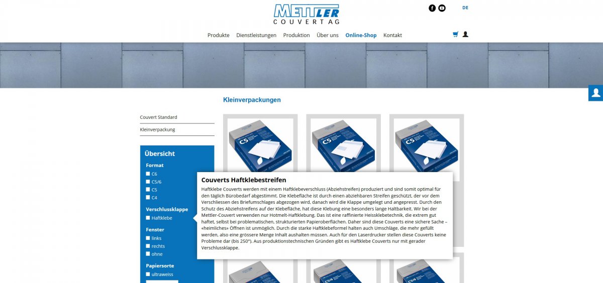 Der neue Webauftritt bietet umfangreiche Informationen über die verschiedenen Kuvertprodukte, -Formate und -Ausführungen mit direkter Bestellmöglichkeit im eShop. Die mehrsprachige Seite liefert weiter umfangreiche Informationen über die Services und individuelle Leistungen der Mettler Couvert AG. Der eShop bietet einen Produktekonfigurator / Produktfilter an, der es ermöglicht, über gezielte Auswahl schnell zum gewünschten Produkt zu gelangen. Neben Kuverts werden auch Kleinverpackungen und OEM Produktionen angeboten.