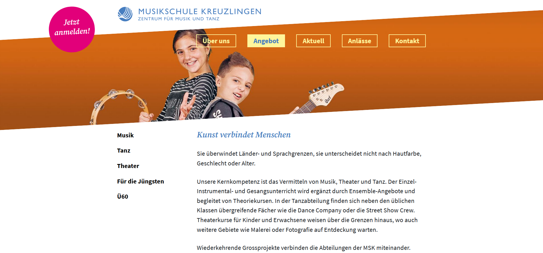 Die Kernkompetenz der Musikschule Kreuzlingen ist das Vermitteln von Musik, Theater und Tanz. Der Einzel-Instrumental- und Gesangsunterricht wird ergänzt durch Ensemble-Angebote und begleitet von Theoriekursen. In der Tanzabteilung finden sich neben den üblichen Klassen übergreifende Fächer wie die Dance Company oder die Street Show Crew. Theaterkurse für Kinder und Erwachsene weisen über die Grenzen hinaus, wo auch weitere Gebiete wie Malerei oder Fotografie auf Entdeckung warten.