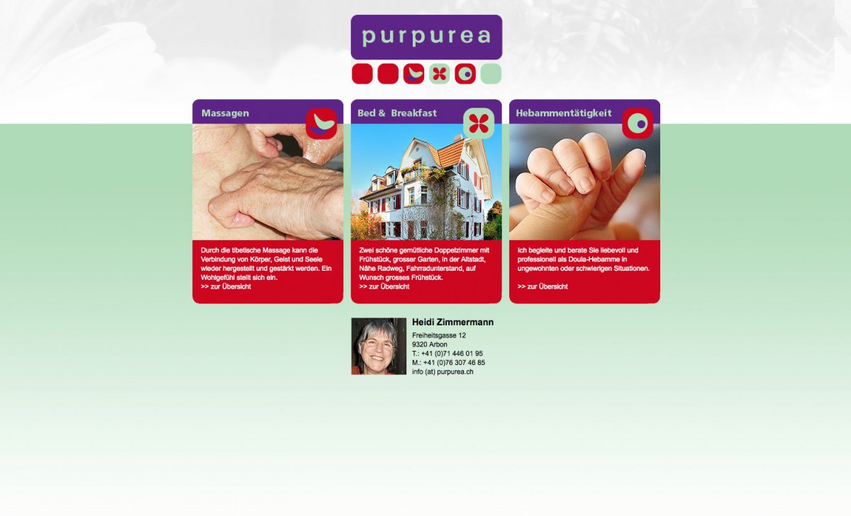 Heidi Zimmermann führt ein kleines Bed and Breakfast in Arbon, sie bietet auch tibetische Massagen an und ist als Hebamme tätig. Ziel des Auftrags war es alle diese drei Tätigkeiten unter Berücksichtigung des CI / CD mittels einer einfachen Webseite zu vereinen.