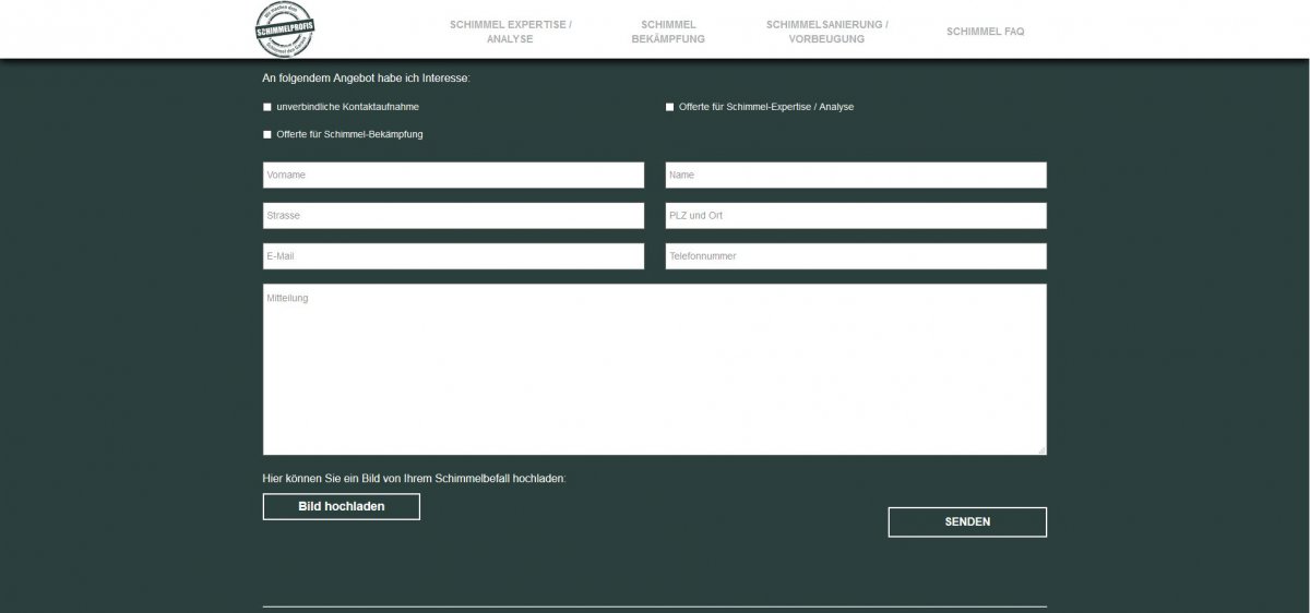 visions.ch erarbeitete das Konzept und realisierte die Webseite für Schimmelprofis inklusive responsives Design. Wie ebenfalls das Logo, das nun die Firmenfahrzeuge der Schimmelprofis ziert. Die Seite beinhaltet anschauliche Vorher-Nachher-Bilder sowie ein Kontaktformular für Kunden mit der Möglichkeit, Bilder hochzuladen.