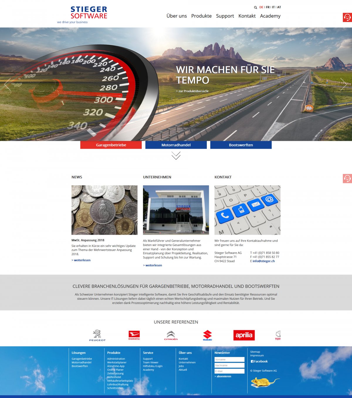 Die Stieger Software AG aus Staad ist Schweizer Marktführerin im Bereich Garagensoftware und bietet Branchenlösungen für das Automobilgewerbe, für den Motorradhandel und für Werften. visions.ch realisiert die neue Webseite in Zusammenarbeit mit der Kommunikationsagentur Brains'n'Hands, Matthias Sönmez, Wil.